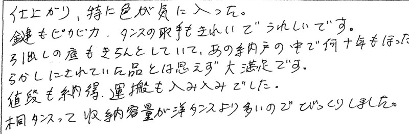 「想像以上の仕上がりに感動しております。およそ60年前の母の嫁入り道具のタンスが新しく生まれ変わりました。これから先、50年、100年先まで伝えていきたいと思います。心より感謝いたします。」